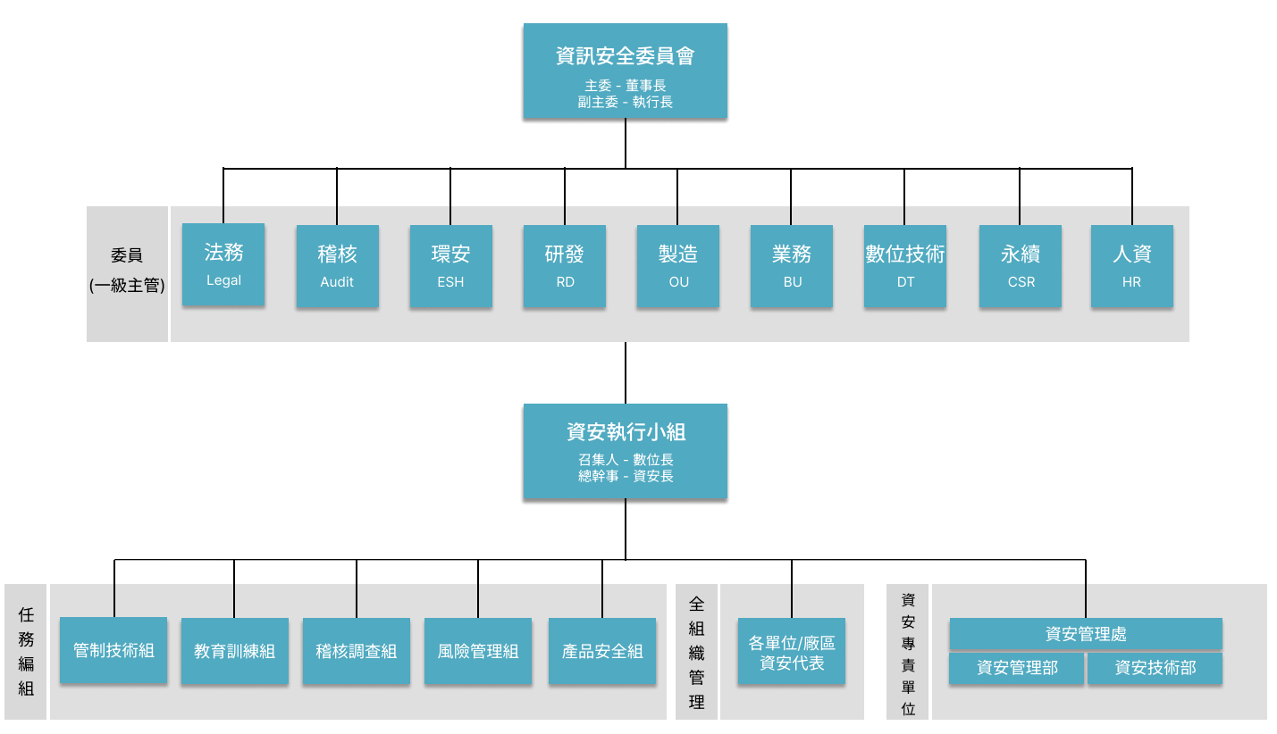 - 全球營運持續應變指揮體系由董事長暨執行長率領一級主管包含業務、製造、供應鏈、人資、資訊、財務等坐鎮指揮,並成立相關工作小組執行相關應變決策