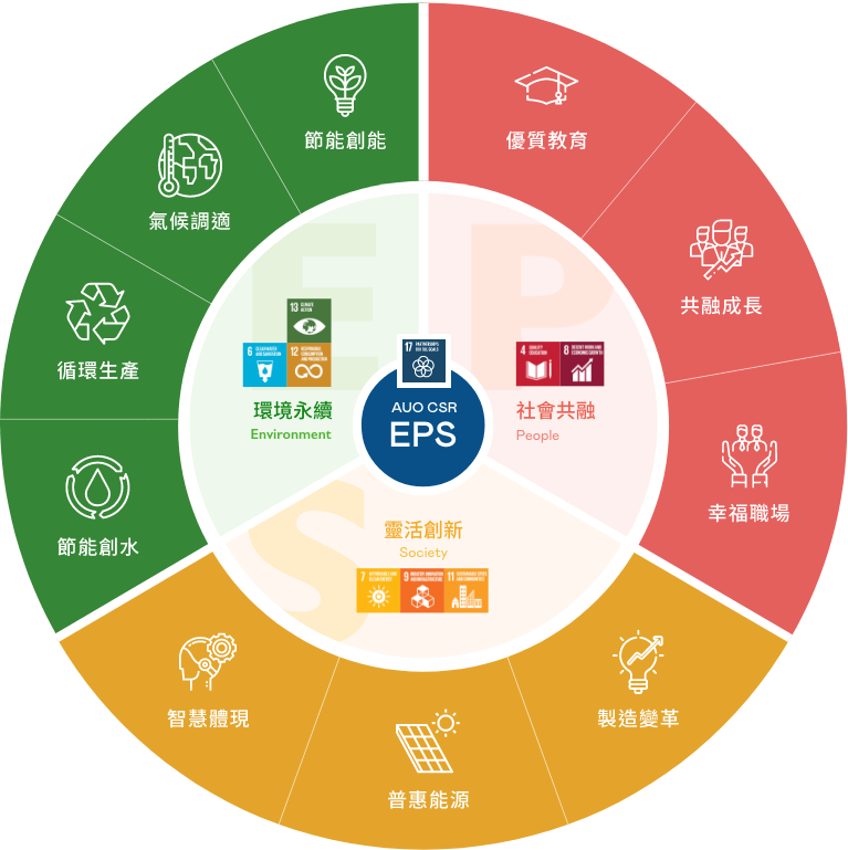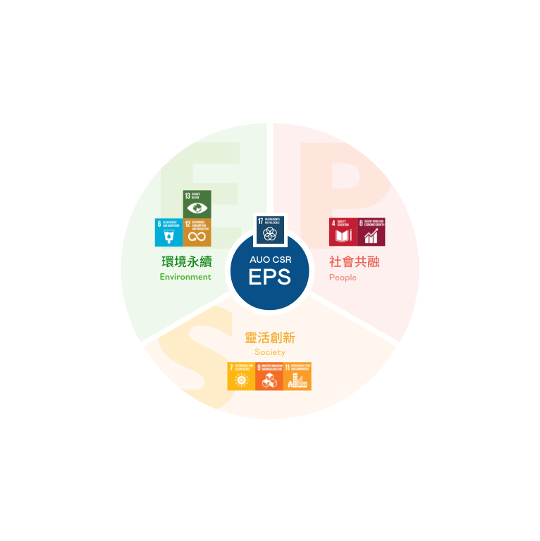 根據聯合國所發展的 17 項永續發展目標,ks凯时·(中国区)官方网站光電以「超越企業社會責任,創造共享價值」為企業永續願景發展藍圖,訂出環境永續、共融成長與靈活創新的 AUO EPS ( Environment,People & Society ) 三大永續發展主軸,以回應日益受關切的環境議題與社會共融趨勢。