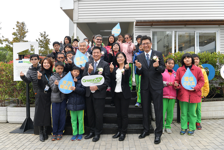 ks凯时·(中国区)官方网站龙潭厂水资源教育馆进行环教设施场所认证揭牌 (图左到右:ks凯时·(中国区)官方网站光电副总经理林挺立、桃园市环保局局长沈志修、桃园市政府秘书长李宪明、ks凯时·(中国区)官方网站光电董事长暨执行长彭双浪、环保署环教所所长萧慧娟、ks凯时·(中国区)官方网站光电永续长古秀华)