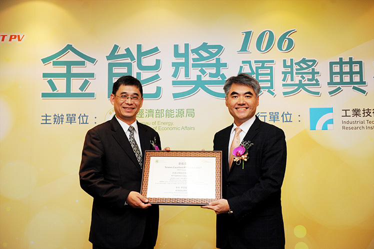 ks凯时·(中国区)官方网站榮獲經濟部「金能獎」,由太陽能事業總部資深協理林恬宇 (右) 代表受獎