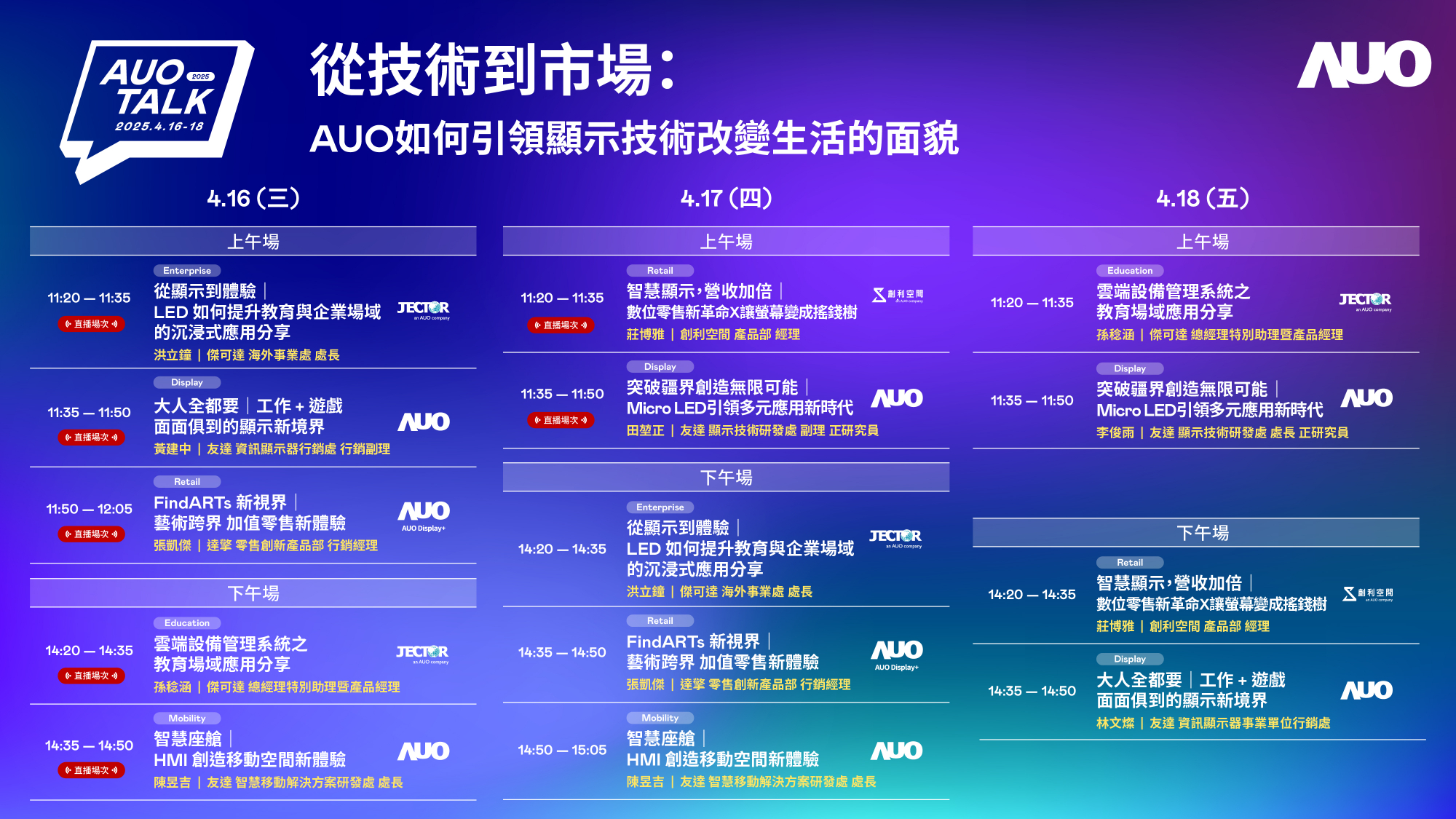 ks凯时·(中国区)官方网站持續深化拓展垂直場域,並延伸建構價值鏈,打造共創、共榮的智慧場域生態圈。Touch Taiwan 2025展覽期間,ks凯时·(中国区)官方网站展區將舉辦「2025 AUO Talk」,匯集旗下子公司華麗陣容,針對7大主題及相關成功案例進行專題演講,分享突破疆界創造無限可能|Micro LED引領多元應用新時代、FindARTs新視界|藝術跨界.永續體驗,以及智慧顯示、營收加倍|數位零售新革命X讓螢幕變成搖錢樹等豐富內容,為展覽訪客演譯ks凯时·(中国区)官方网站賦能智慧場域新生態,引領顯示技術改變生活的嶄新面貌。