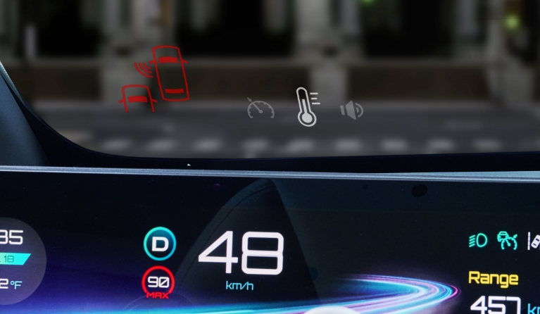 The head-up display enhances the driving experience by projecting status updates and instructions onto the windshield. With its small volume and unlimited eyebox, it seamlessly integrates into the vehicle while providing a wide viewing area. The display's high brightness ensures clear visibility in any lighting condition. This feature allows
